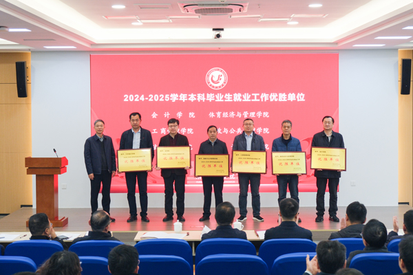 会上宣读《关于表彰2024-2025学年毕业生就业工作优胜单位和先进个人的决定》,表彰了学校2024-2025学年毕业生就业工作优胜单位和先进个人。财政与公共管理学院、艺术设计学院、会计学院和法学院代表作交流发言。