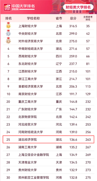 本网讯 4月15日,高等教育专业评价机构软科发布2026软科中国大学排名,我校位居主榜榜单第263位、财经类榜单第25位,相比2025年分别上升12、4个位次。